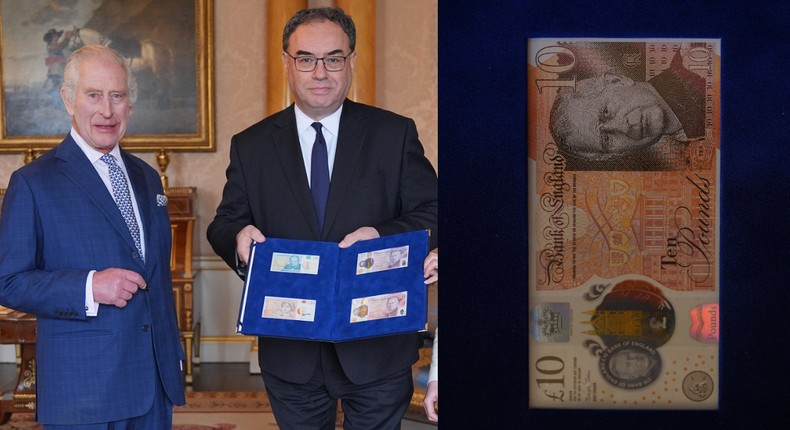 King Charles III (left) is presented with the first bank notes featuring his portrait from the Bank of England Governor Andrew Bailey and Sarah John, the Bank of England's Chief Cashier, at Buckingham Palace, April 9, 2024 in London, England. [Getty Images]